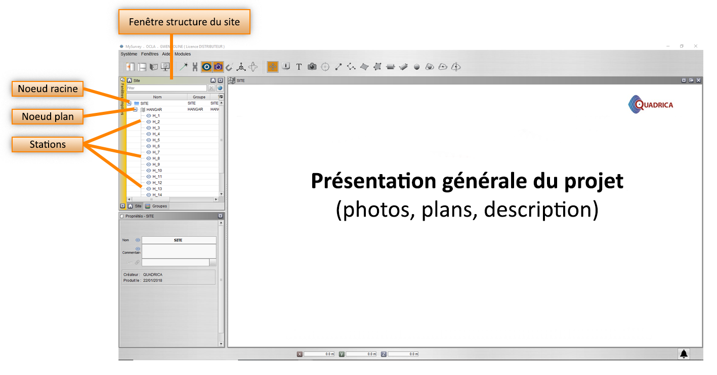 d. Fenêtre Structure de Site : arborescence du Site selon plusieurs niveaux ou zones, avec la liste des points de vue réalisés.