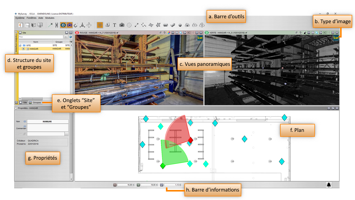 g. Fenêtre Propriétés : propriétés de l’objet ou du nœud de l’arborescence sélectionné et fonctions de visualisation liées.