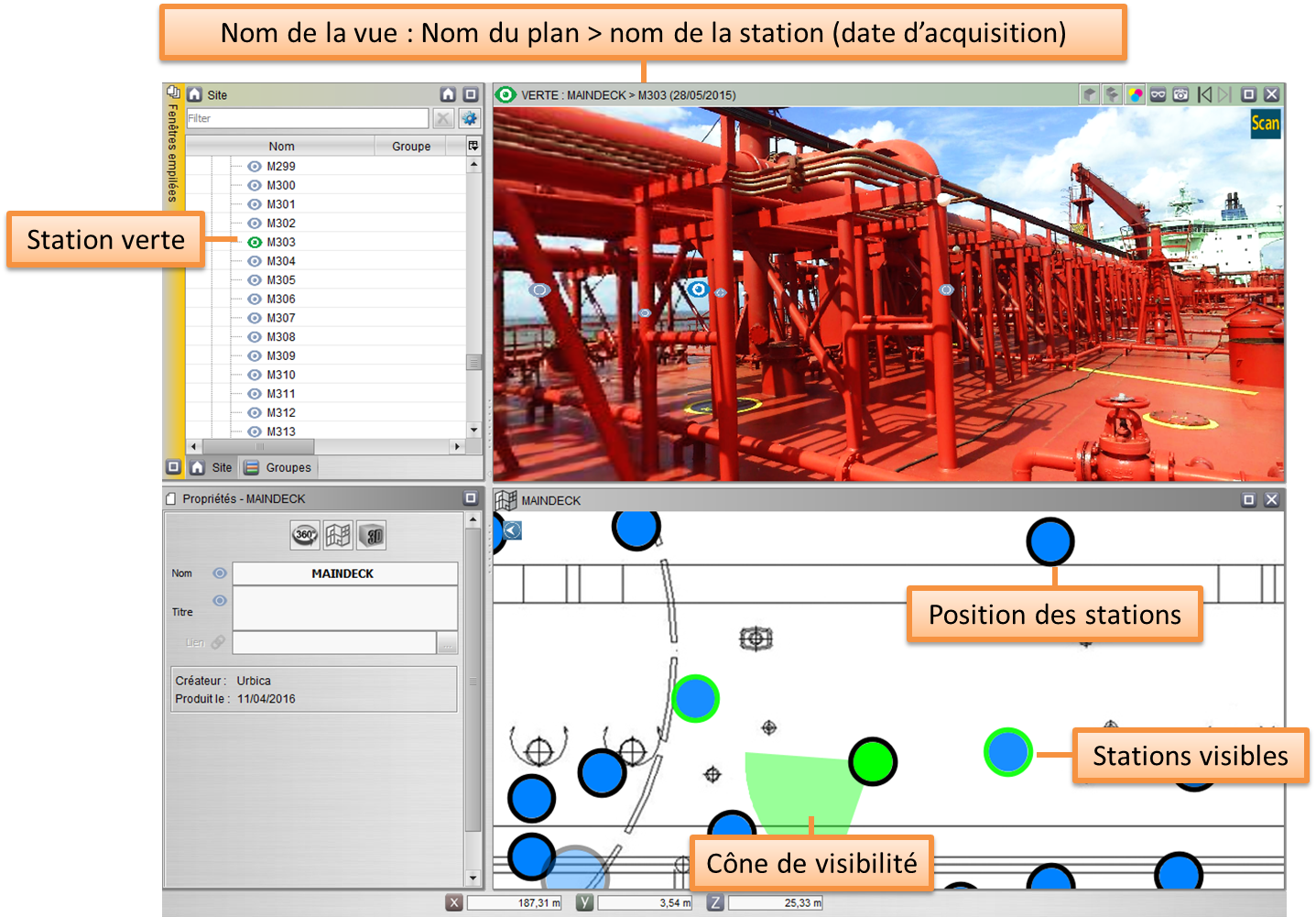 Ces codes couleurs sont utilisés dans les barres de titre des fenêtres des vues panoramiques, dans l’arborescence de la structure de site, au sein même des vues lorsque les stations sont limitrophes et dans la vue en plan au travers des cônes de visibilité. De plus, sur la vue en plan, les stations visibles depuis la vue ouverte sont entourées de la couleur de celle-ci.