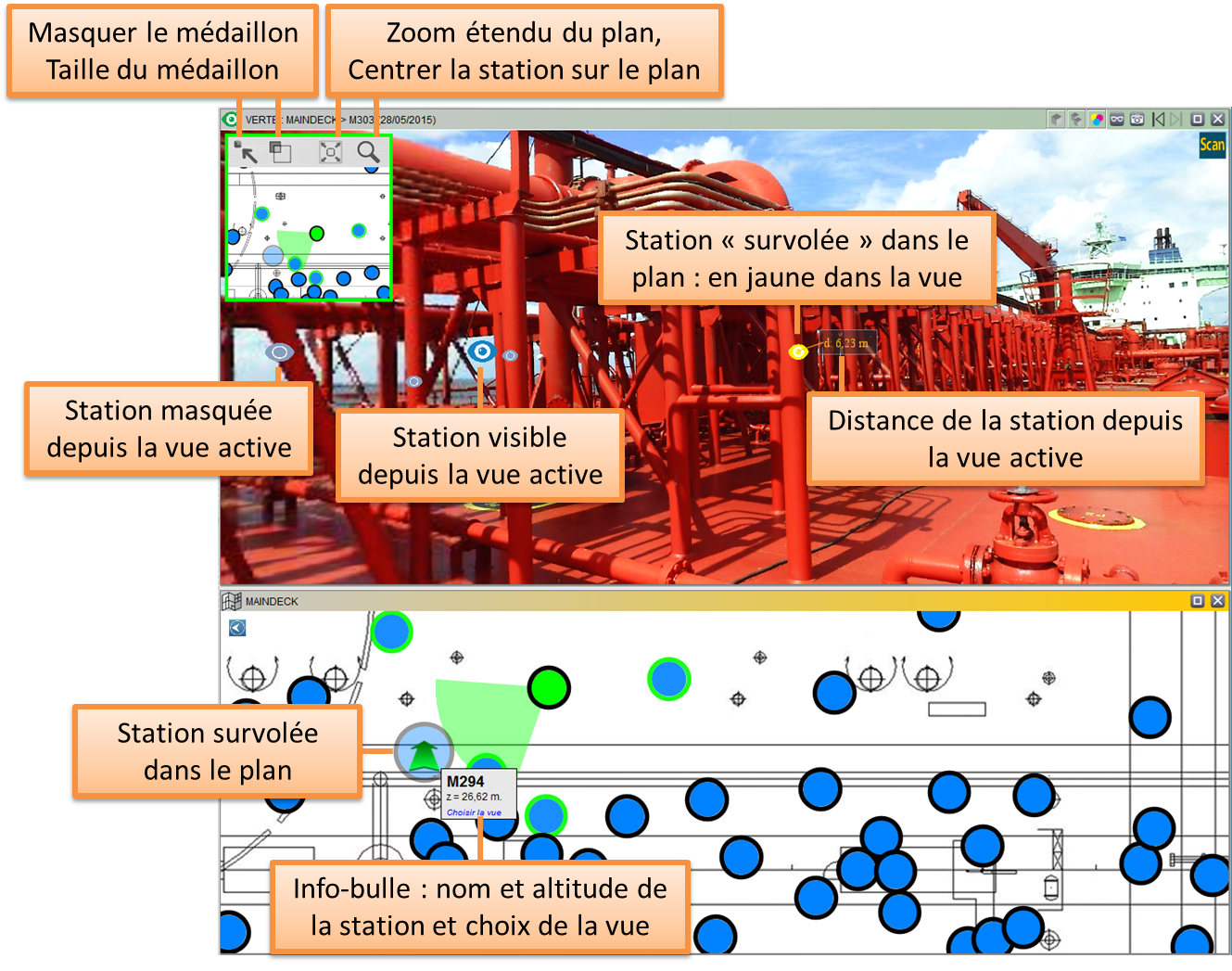 Le code couleur « jaune » est réservé à l’identification de la station « survolée » par la souris dans la vue en plan ou dans la vue panoramique.
