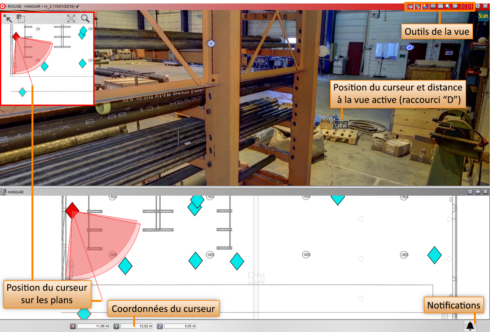 Lorsque le pointeur de la souris survole un point du nuage, les coordonnées de ce point s’affichent dans la barre d’information.