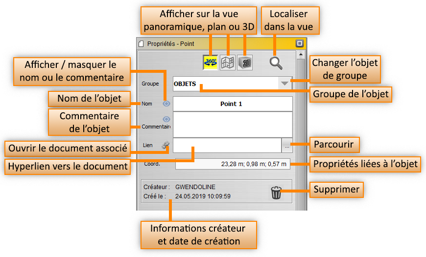 La partie basse de la fenêtre indique le nom de l’utilisateur ayant créé l’objet ainsi que la date de dernière modification. L’icône poubelle sert à supprimer l’objet.