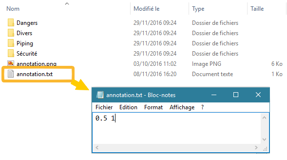 Le décentrement d’une annotation est propre à chaque icône d’annotation. Dans le dossier contenant le fichier image de l’icône, il faut rajouter au même endroit un fichier texte portant exactement le même nom de l’image, avec l’extension .txt.