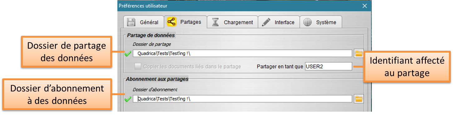 Le dossier depuis lequel l’utilisateur peut s’abonner à des groupes ainsi que le dossier vers lequel il peut partager sont configurables dans cet onglet.