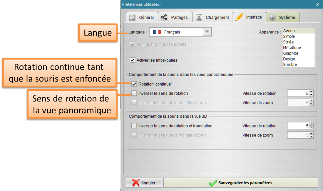 Les paramètres de rotation dans les vues panoramiques et 3D peuvent être configurés. La rotation continue permet à la vue de continuer de tourner tant que la souris n’est pas relâchée. Le sens de rotation peut être choisi.