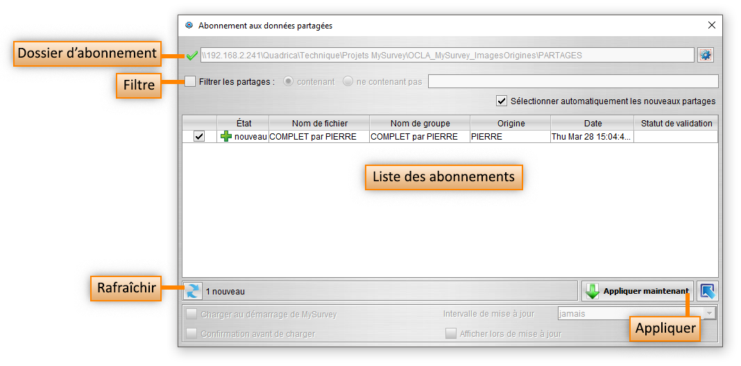 Un utilisateur peut configurer un abonnement au dossier partagé afin d’importer les objets partagés par les autres utilisateurs.