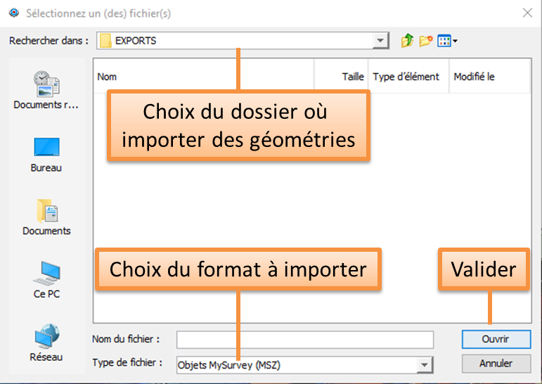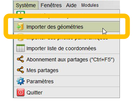 L’import se fait par le menu Système puis en sélectionnant « Importer des géométries ».