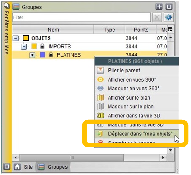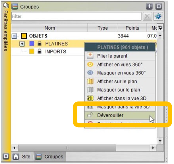 Une fois le groupe déplacé dans la zone « OBJETS » le groupe reste en l’état « verrouilé ». L’option de déverrouillage du groupe est disponible via le menu clic-droit. De la même manière il est possible de re-vérrouiller le groupe ultérieurement.