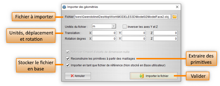 - pour le format OBJ, il est possible de « Reconstruire les primitives à partir des maillages ». Il s’agit de la reconnaissance de quelques formes dans le modèle afin de créer plusieurs objets à partir d’un seul objet au format OBJ.