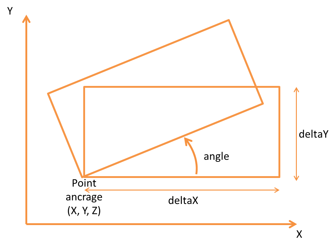 • rotation : angle en degré entre l’axe des X et le rectangle, dont le centre de rotation est le point d’ancrage du rectangle. Voir le schéma explicatif ci-après. Il est possible de ne mettre aucune valeur entre les guillemets pour la valeur de l’angle de rotation. Dans ce cas, le rectangle sera aligné le long de l’axe X.