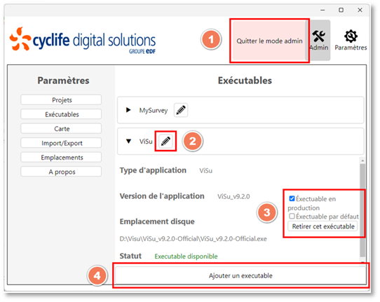 « Exécutable par défaut » permet à l’administrateur d’ouvrir cette version de visu par défaut.