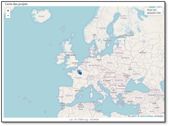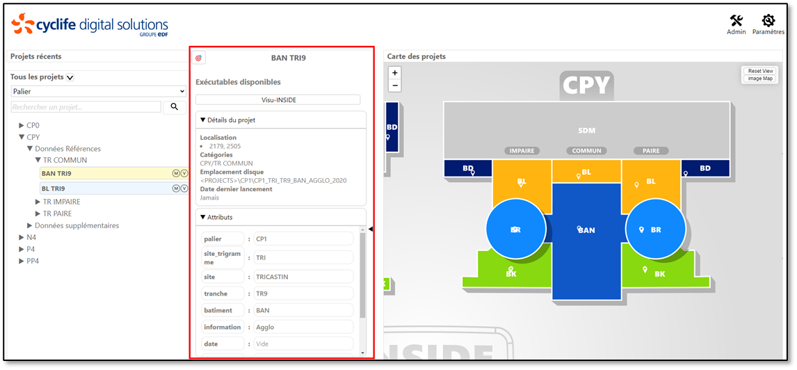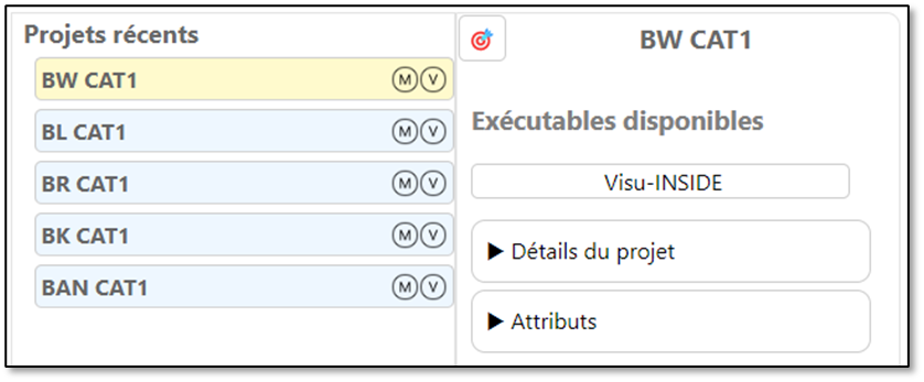 Lorsqu’un projet est sélectionné, l’utilisateur à accès à ses informations et ses métadonnées (Nom, emplacement, date, attributs, …).